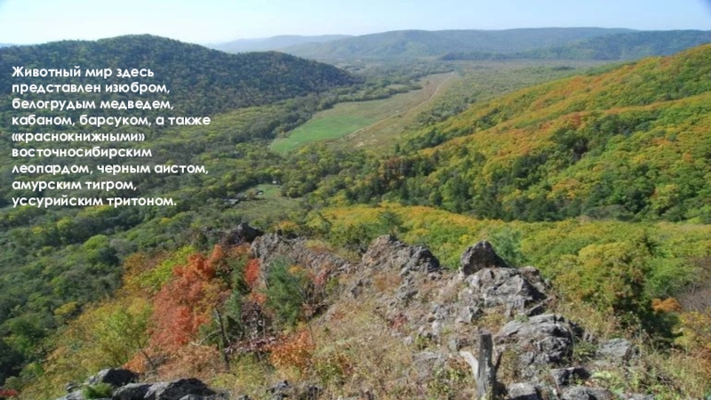 Слайд 12Животный мир здесь представлен изюбром, белогрудым медведем, кабаном, барсуком, а также