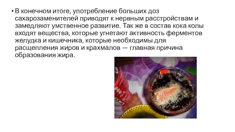 и замедляют умственное развитие. Так же в состав кока колы входят вещества, которые угнетают активность ферментов желудка и кишечника, которые необходимы для расщепления жиров и крахмалов — главная причина образования жира.