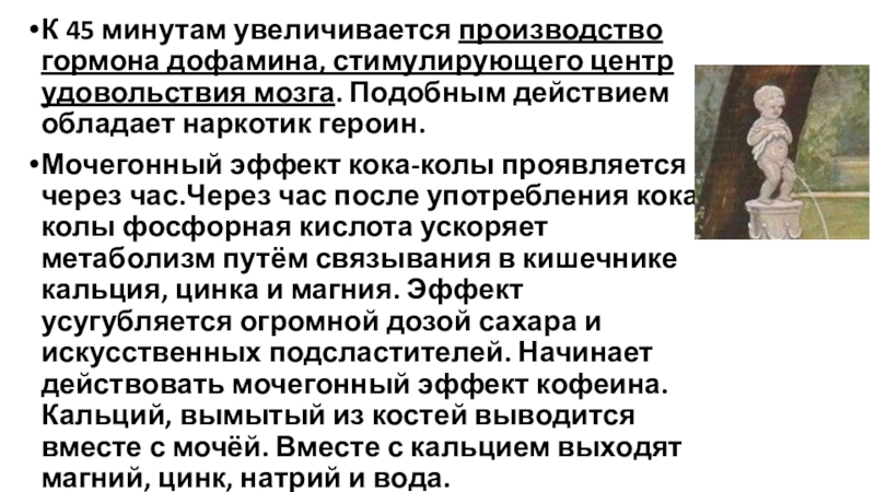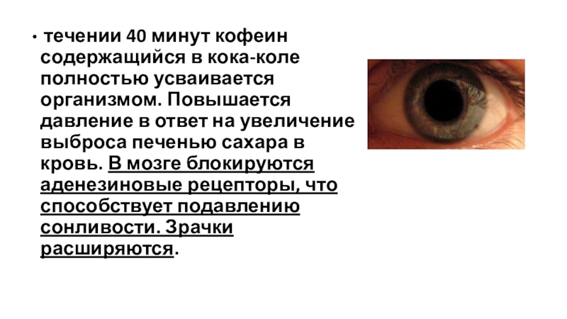 Слайд 7 течении 40 минут кофеин содержащийся в кока-коле полностью усваивается организмом.