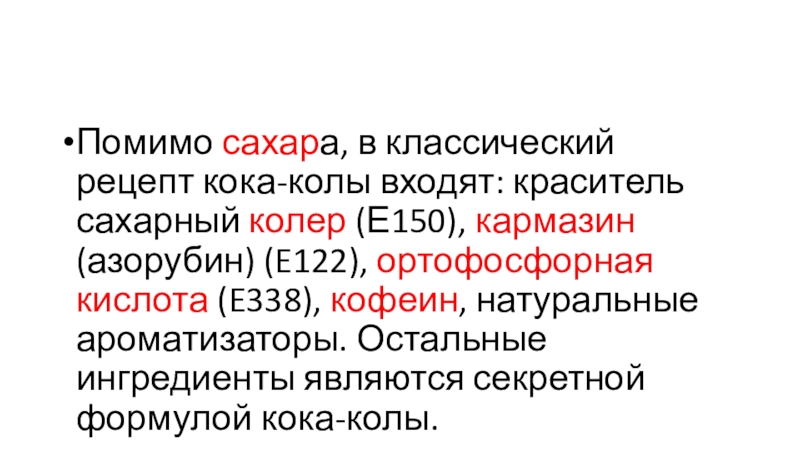 Слайд 4Помимо сахара, в классический рецепт кока-колы входят: краситель сахарный колер (Е150),