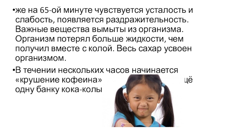 В течении нескольких часов начинается «крушение кофеина» и хочется выпить ещё одну банку кока-колы.