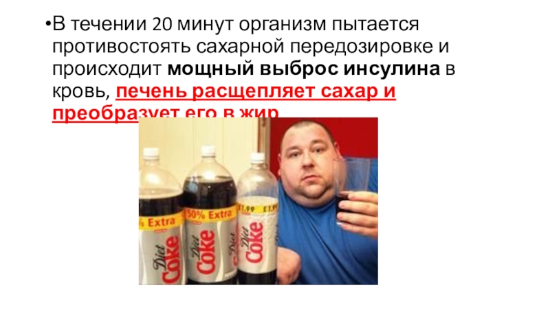 Слайд 6В течении 20 минут организм пытается противостоять сахарной передозировке и происходит