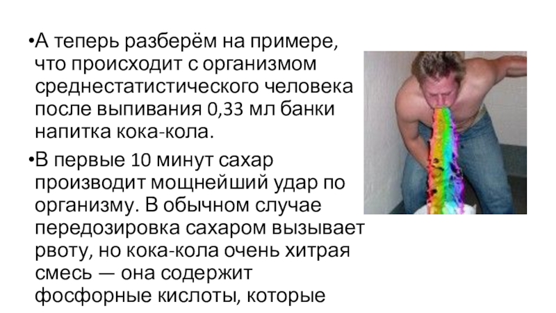 В первые 10 минут сахар производит мощнейший удар по организму. В обычном случае передозировка сахаром вызывает рвоту, но кока-кола очень хитрая смесь — она содержит фосфорные кислоты, которые предотвращают рвоту.