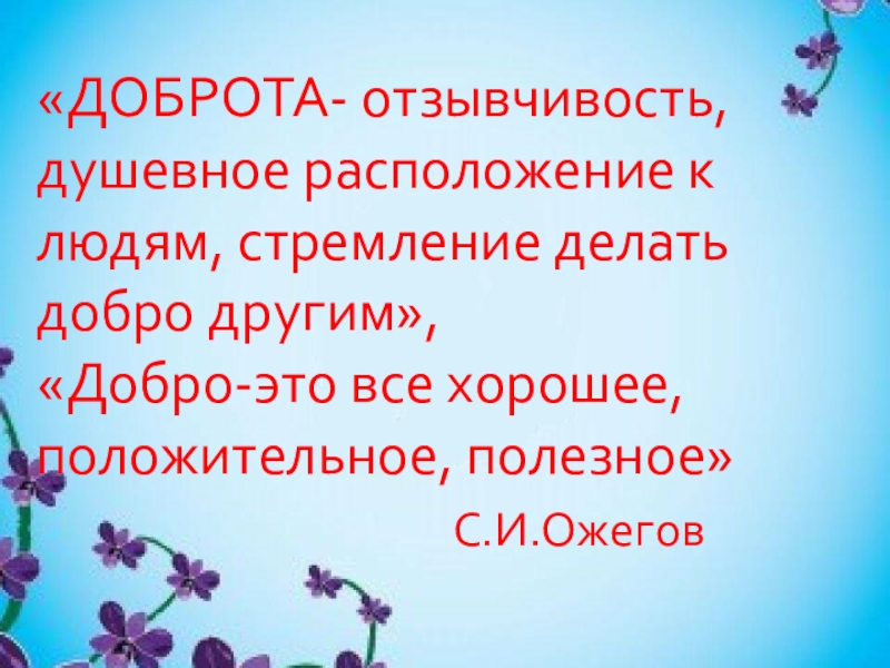 «ДОБРОТА- отзывчивость, душевное расположение к людям, стремление делать добро другим»,«Добро-это все хорошее,положительное, полезное» С.И.Ожегов