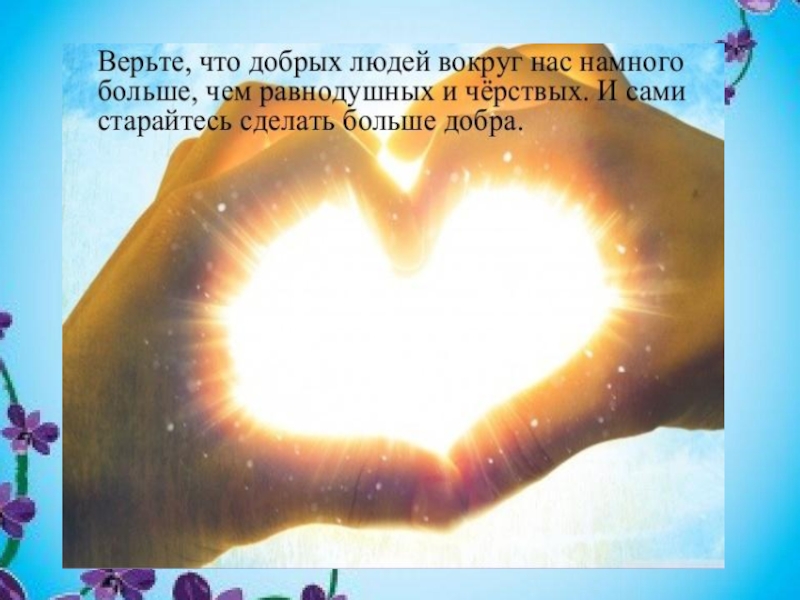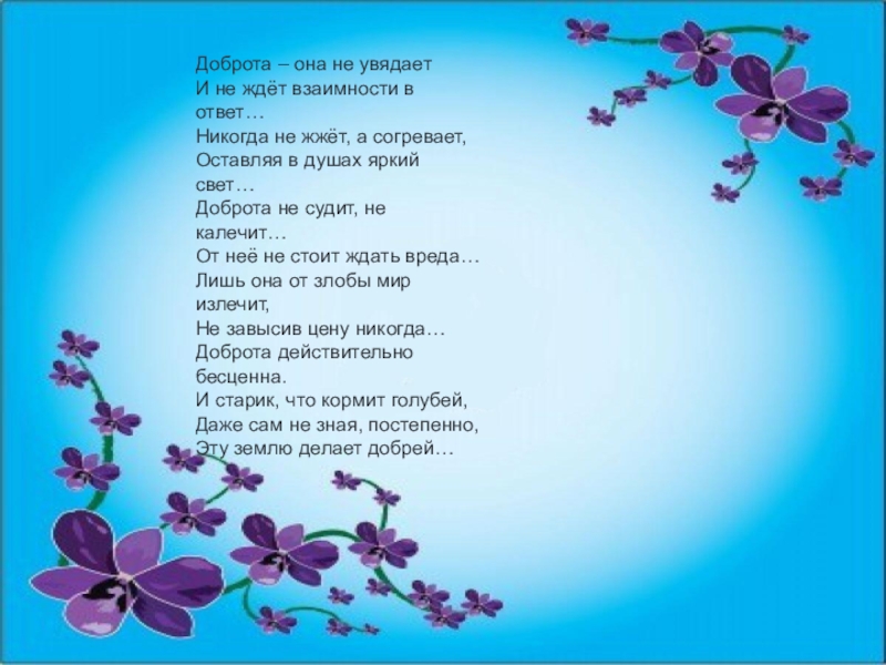 Слайд 10Доброта – она не увядает И не ждёт взаимности в ответ… Никогда не