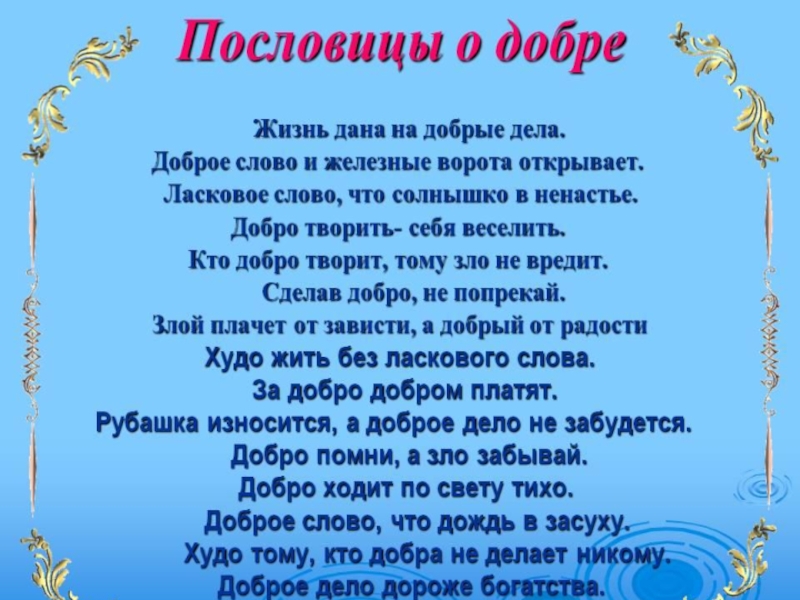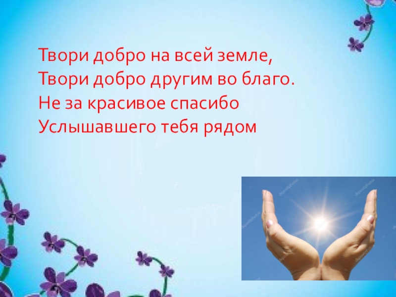 Твори добро на всей земле, Твори добро другим во благо. Не за красивое спасибо Услышавшего тебя рядом