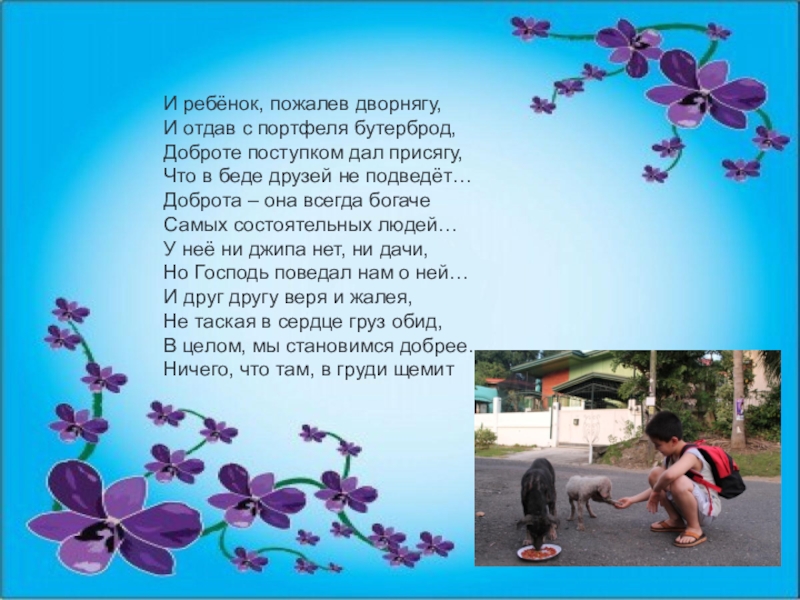 Доброта – она всегда богаче Самых состоятельных людей… У неё ни джипа нет, ни дачи, Но Господь поведал нам о ней…