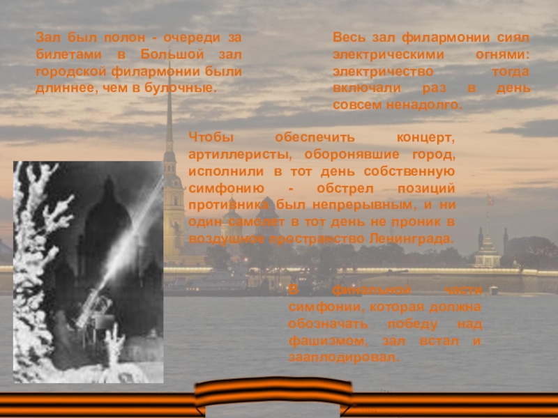 Чтобы обеспечить концерт, артиллеристы, оборонявшие город, исполнили в тот день собственную симфонию - обстрел позиций противника был непрерывным, и ни один самолет в тот день не проник в воздушное пространство Ленинграда.