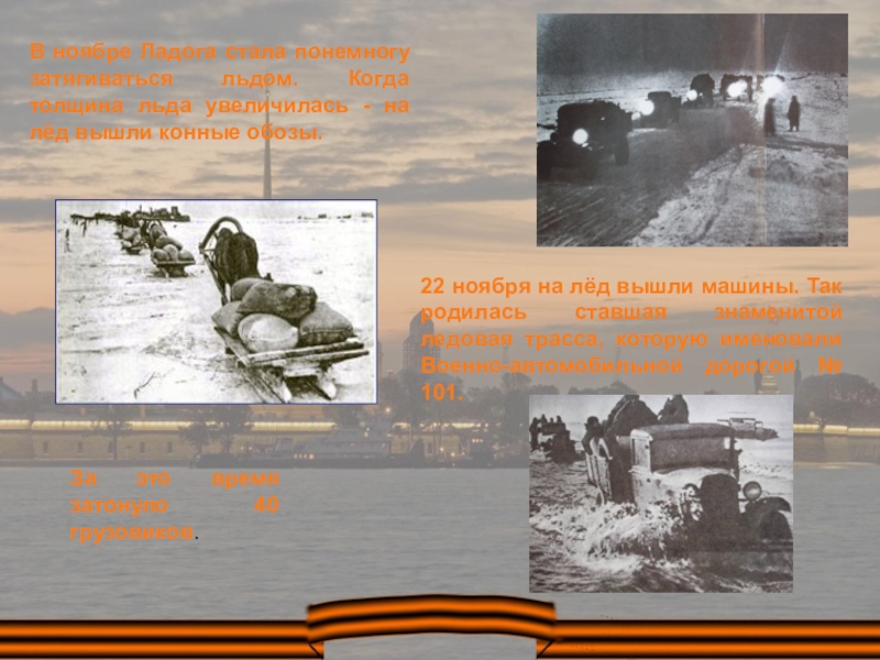 22 ноября на лёд вышли машины. Так родилась ставшая знаменитой ледовая трасса, которую именовали Военно-автомобильной дорогой № 101.