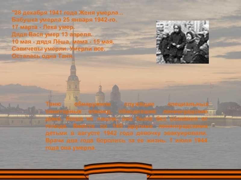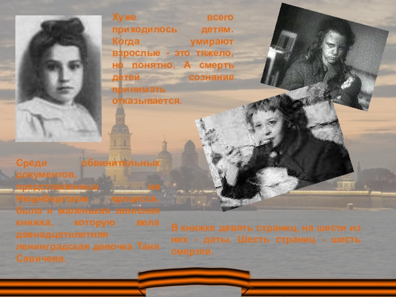 Среди обвинительных документов, представленных на Нюрнбергском процессе, была и маленькая записная книжка, которую вела двенадцатилетняя ленинградская девочка Таня Савичева.