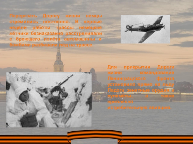 Перерезать Дорогу жизни немцы стремились постоянно. В первые недели работы трассы немецкие лётчики безнаказанно расстреливали с бреющего полёта автомашины и бомбами разбивали лёд на трассе.