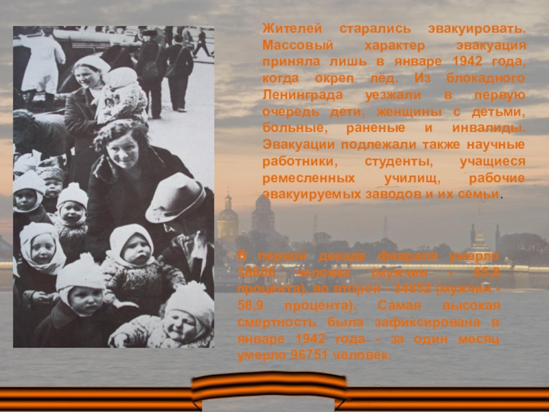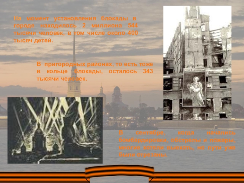 На момент установления блокады в городе находилось 2 миллиона 544 тысячи человек, в том числе около 400 тысяч детей.