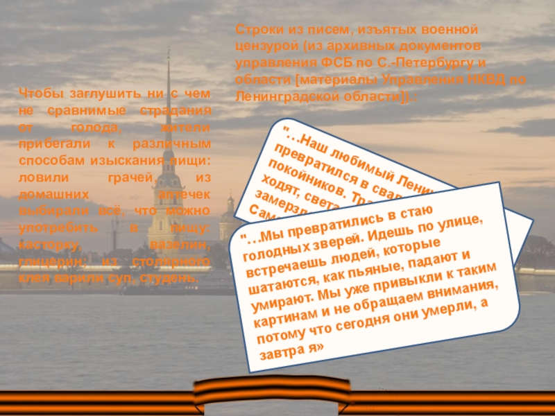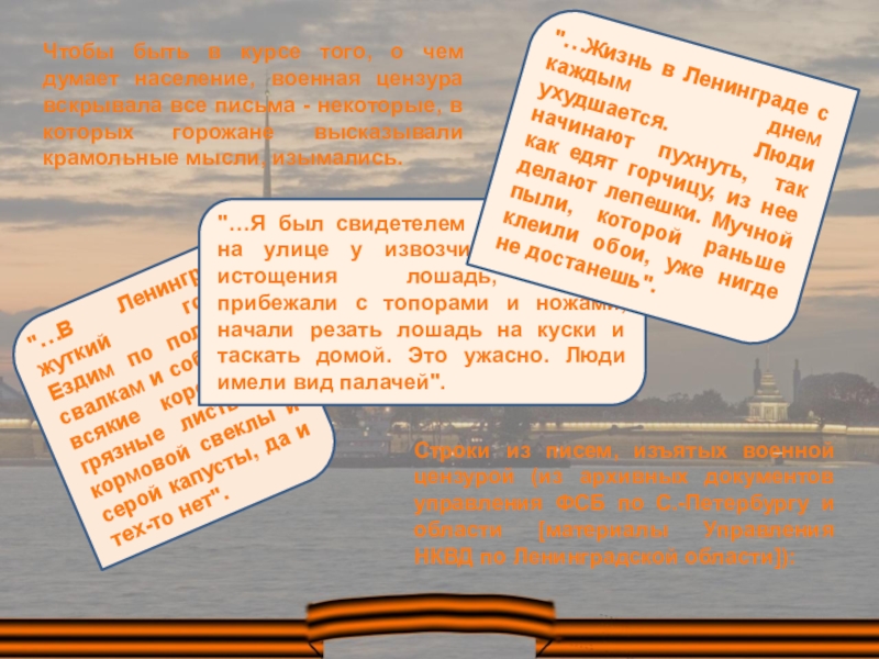 Строки из писем, изъятых военной цензурой (из архивных документов управления ФСБ по С.-Петербургу и области [материалы Управления НКВД по Ленинградской области]).: