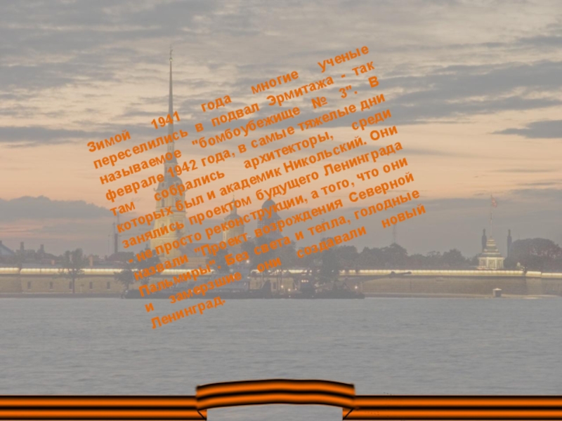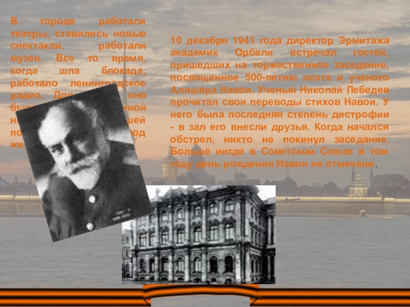 10 декабря 1941 года директор Эрмитажа академик Орбели встречал гостей, пришедших на торжественное заседание, посвященное 500-летию поэта и ученого Алишера Навои. Ученый Николай Лебедев прочитал свои переводы стихов Навои. У него была последняя степень дистрофии - в зал его внесли друзья. Когда начался обстрел, никто не покинул заседание. Больше нигде в Советском Союзе в том году день рождения Навои не отмечали.