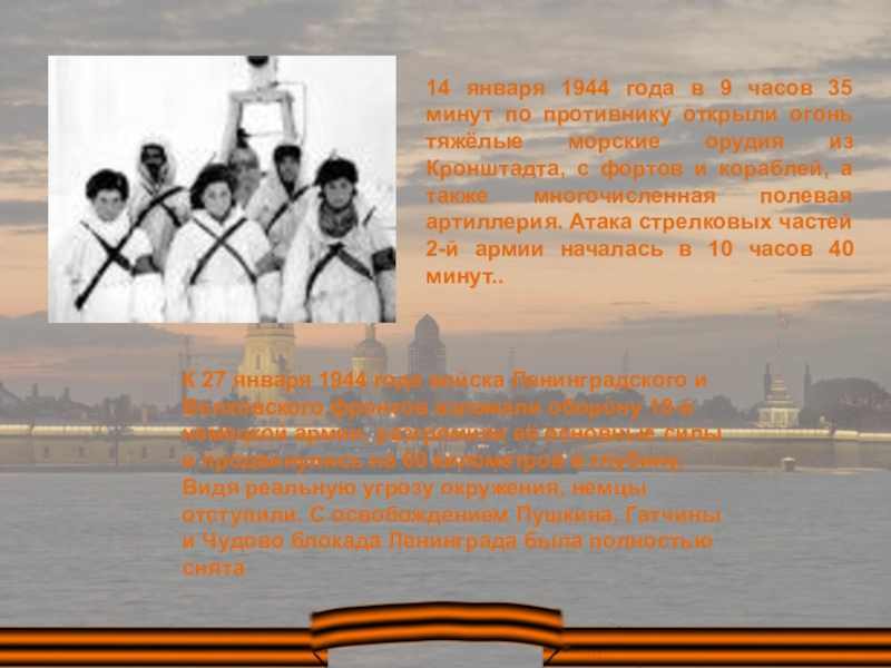 К 27 января 1944 года войска Ленинградского и Волховского фронтов взломали оборону 18-й немецкой армии, разгромили её основные силы и продвинулись на 60 километров в глубину. Видя реальную угрозу окружения, немцы отступили. С освобождением Пушкина, Гатчины и Чудово блокада Ленинграда была полностью снята