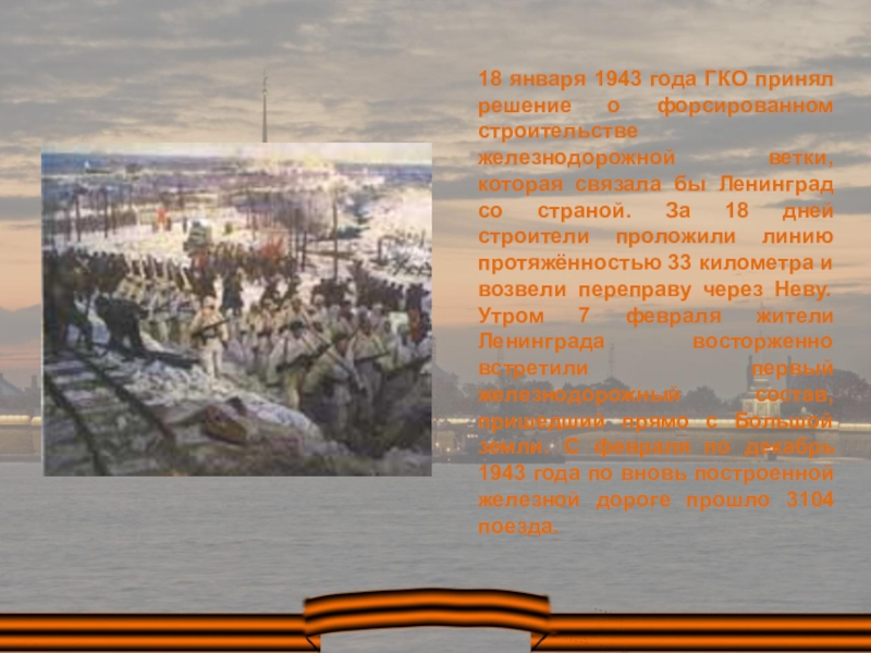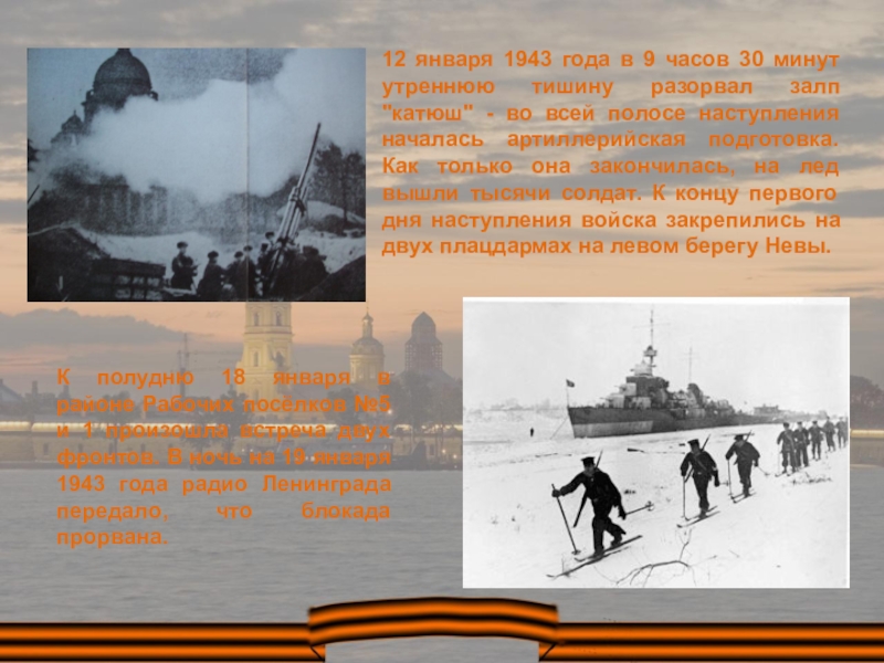 К полудню 18 января в районе Рабочих посёлков №5 и 1 произошла встреча двух фронтов. В ночь на 19 января 1943 года радио Ленинграда передало, что блокада прорвана.