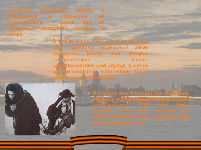 В конце июля 1941 года в наличии был примерно недельный запас продуктов. Более того, создать стратегические запасы продовольствия для города с почти трехмиллионным населением было практически невозможно