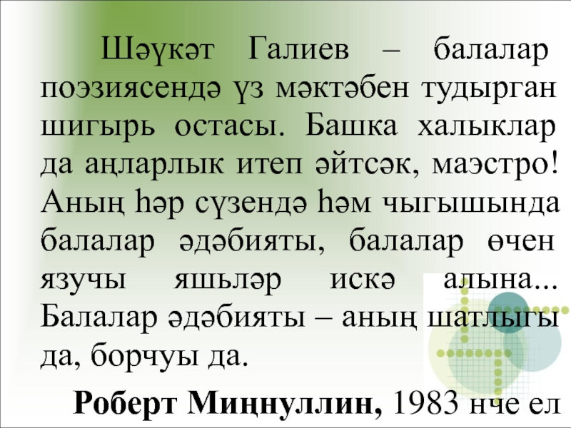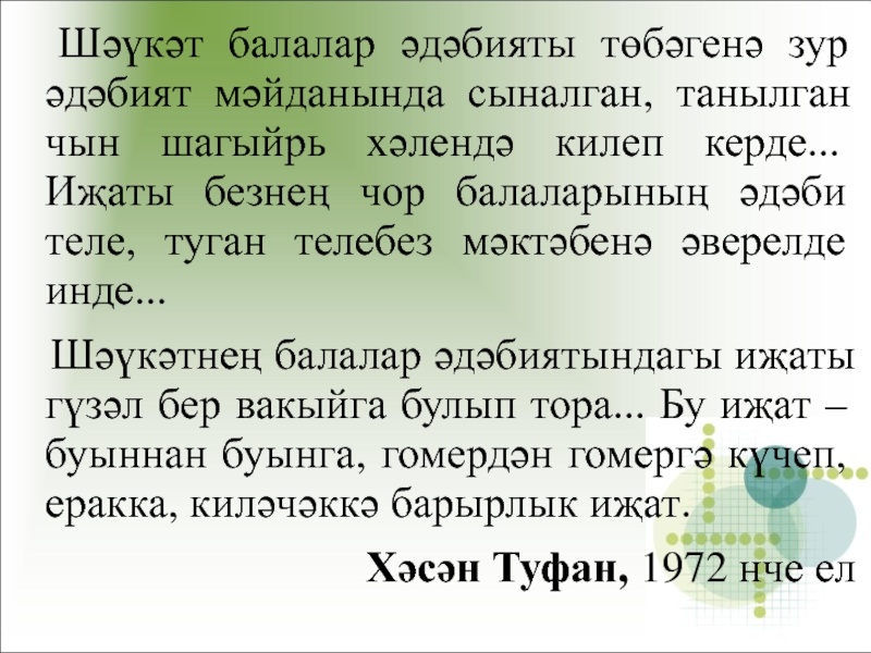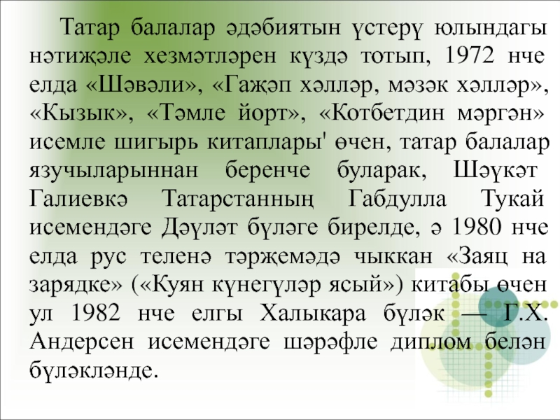 10. Татар балалар әдәбиятын үстерүдәге хезмәтләре өчен, “Шәвәли”, “Гаҗәп хәлләр, мәзәк хәлләр”, “Кызык”, “Тәмле йорт”, “Котбетдин мәргән”шигырь җыентыклары өчен, татар балалар язучыларыннан нинди исем бирелә?