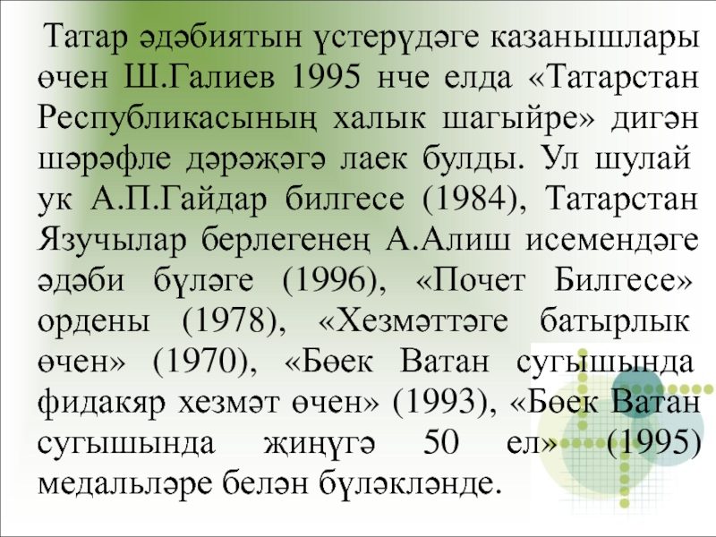 1972нче елда Г.Тукай исемендәге Дәүләт бүләге.