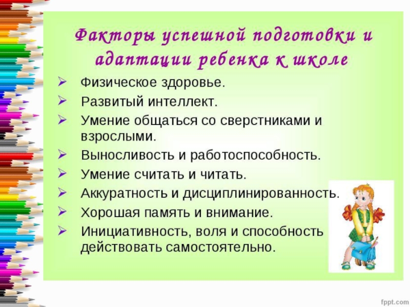 1. Адаптация организма к новым условиям жизни и деятельности, к физическим и интеллектуальным нагрузкам. В данном случае уровень адаптации будет зависеть от возраста ребенка, который пошел в школу; от того, посещал ли он детский сад или его подготовка к школе осуществлялась в домашних условиях; от степени сформированности морфофункциональных систем организма; уровня развития произвольной регуляции поведения и организованности ребенка; от того, как изменялась ситуация в семье