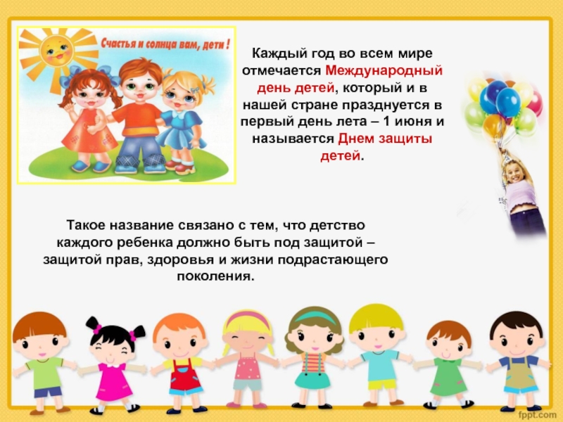 Каждый год во всем мире отмечается Международный день детей, который и в нашей стране празднуется в первый день лета – 1 июня и называется Днем защиты детей.