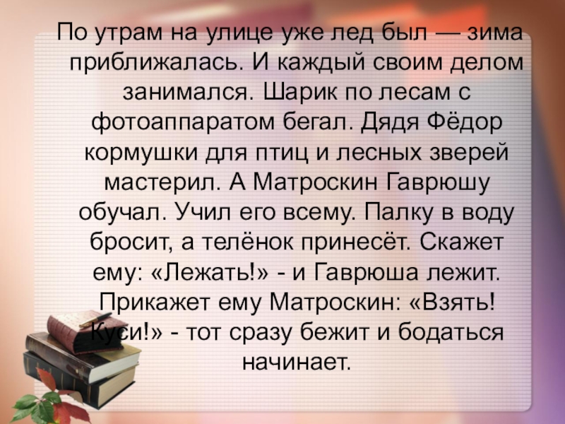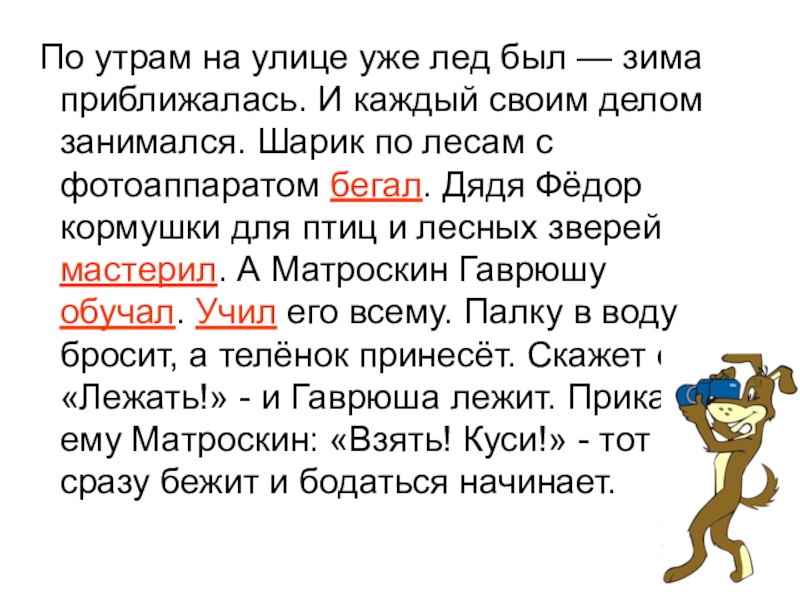И каждый своим делом занимался. Шарик по лесам с фотоаппаратом бегал. Дядя Фёдор кормушки для птиц и лесных зверей мастерил. А Матроскин Гаврюшу обучал. Учил его всему. Палку в воду бросит, а телёнок принесёт. Скажет ему: «Лежать!» - и Гаврюша лежит. Прикажет ему Матроскин: «Взять! Куси!» - тот сразу бежит и бодаться начинает.