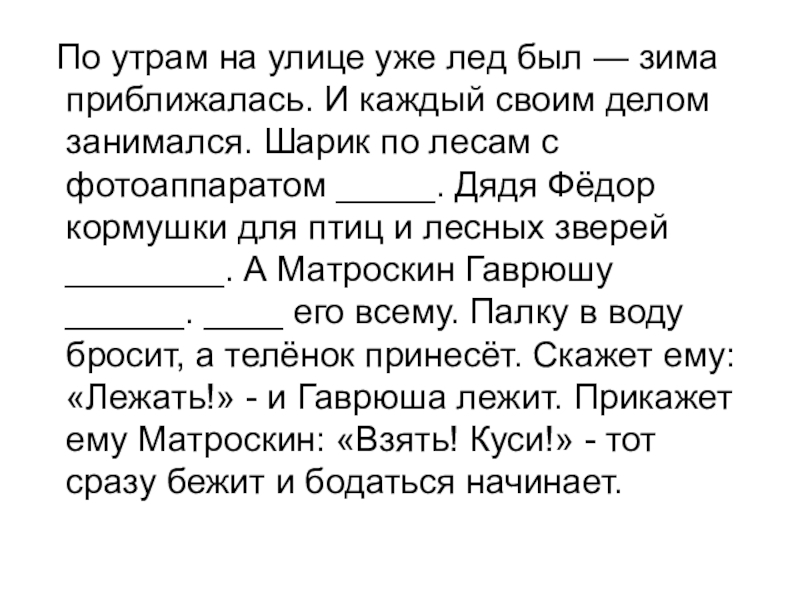 И каждый своим делом занимался. Шарик по лесам с фотоаппаратом _____. Дядя Фёдор кормушки для птиц и лесных зверей ________. А Матроскин Гаврюшу ______. ____ его всему. Палку в воду бросит, а телёнок принесёт. Скажет ему: «Лежать!» - и Гаврюша лежит. Прикажет ему Матроскин: «Взять! Куси!» - тот сразу бежит и бодаться начинает.
