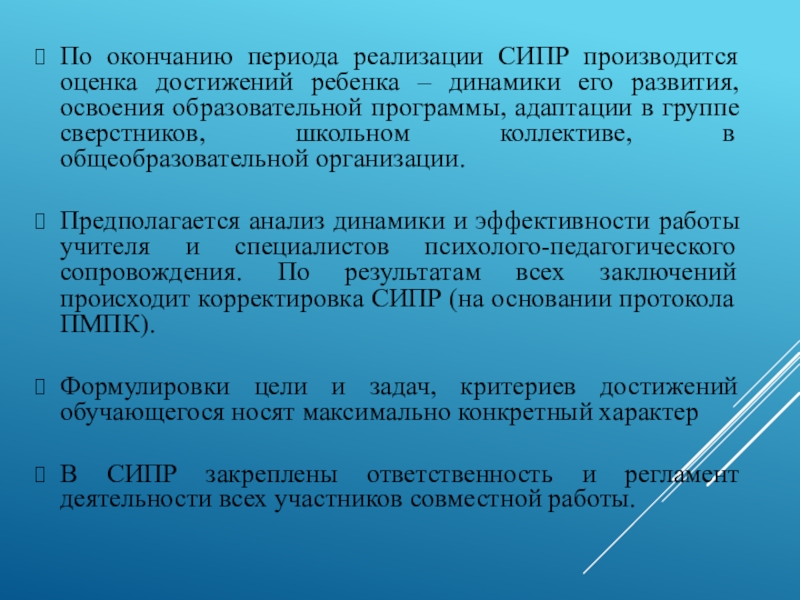 Предполагается анализ динамики и эффективности работы учителя и специалистов психолого-педагогического сопровождения. По результатам всех заключений происходит корректировка СИПР (на основании протокола ПМПК).