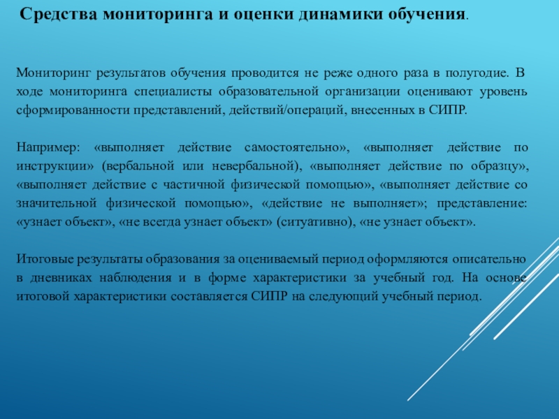 не реже одного раза в полугодие. В ходе мониторинга специалисты образовательной организации оценивают уровень сформированности представлений, действий/операций, внесенных в СИПР.