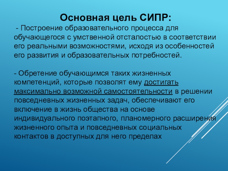 - Построение образовательного процесса для обучающегося с умственной отсталостью в соответствии его реальными возможностями, исходя из особенностей его развития и образовательных потребностей.