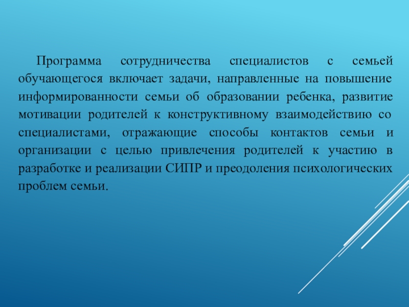 Программа сотрудничества специалистов с семьей обучающегося включает задачи, направленные на