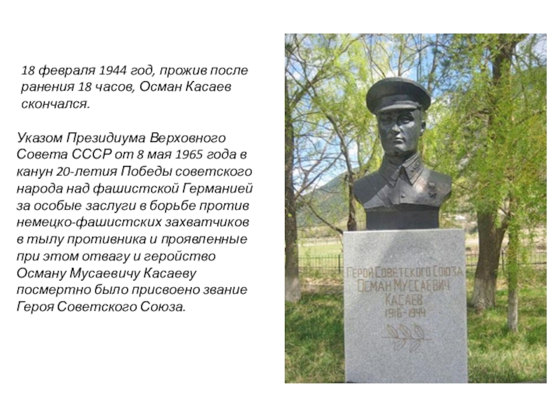 18 февраля 1944 год, прожив после ранения 18 часов, Осман Касаев