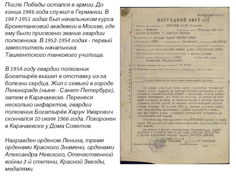 Слайд 8После Победы остался в армии. До конца 1946 года служил в