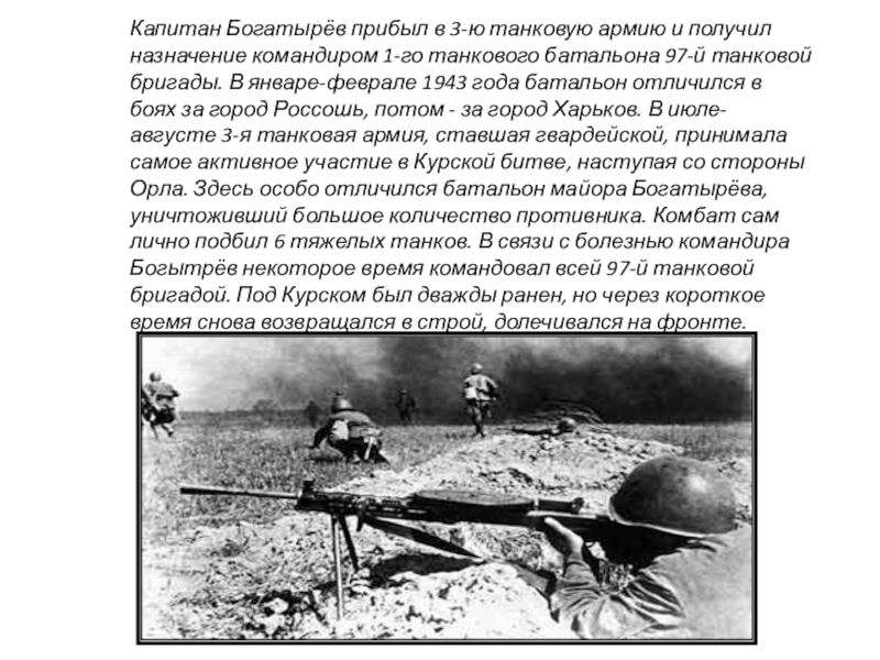 Слайд 4Капитан Богатырёв прибыл в 3-ю танковую армию и получил назначение командиром