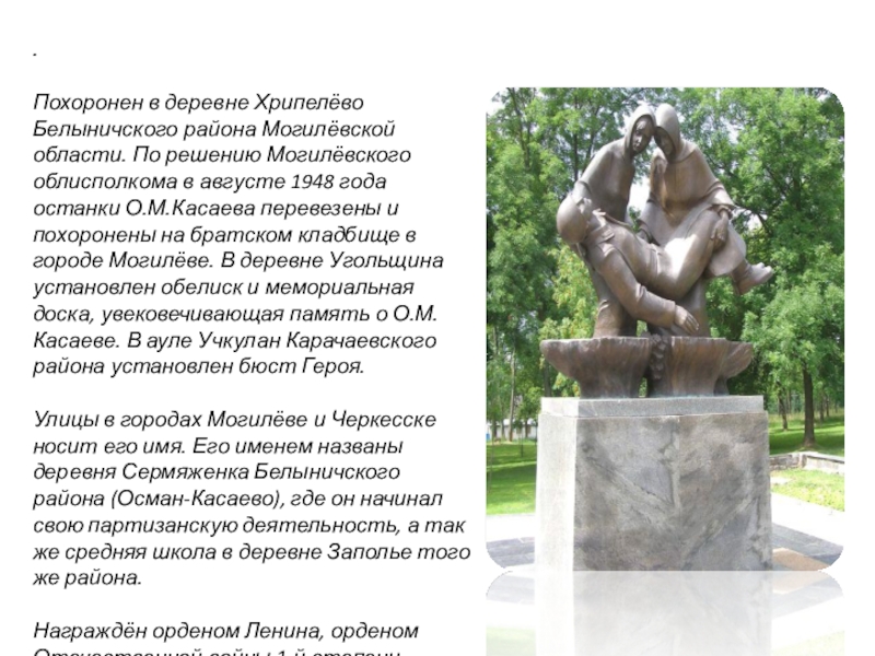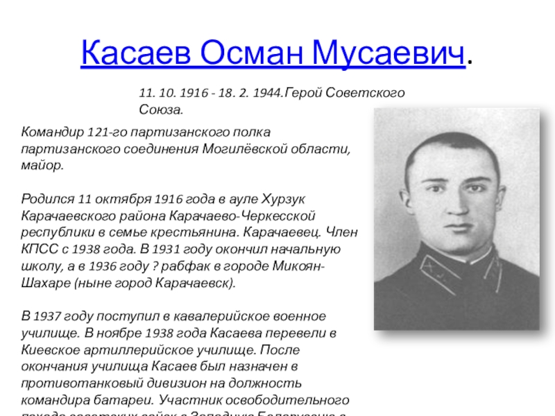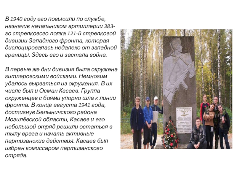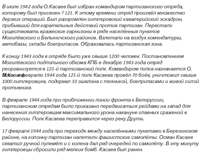Слайд 12В июле 1942 года О.Касаев был избран командиром партизанского отряда, которому