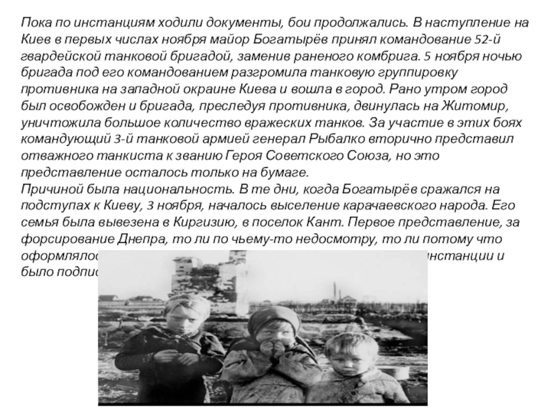 Причиной была национальность. В те дни, когда Богатырёв сражался на подступах к Киеву, 3 ноября, началось выселение карачаевского народа. Его семья была вывезена в Киргизию, в поселок Кант. Первое представление, за форсирование Днепра, то ли по чьему-то недосмотру, то ли потому что оформлялось еще в сентябре-октябре, все таки прошло все инстанции и было подписано.