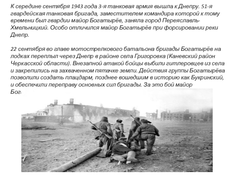 51-я гвардейская танковая бригада, заместителем командира которой к тому времени был гвардии майор Богатырёв, заняла город Переяславль-Хмельницкий. Особо отличился майор Богатырёв при форсировании реки Днепр.