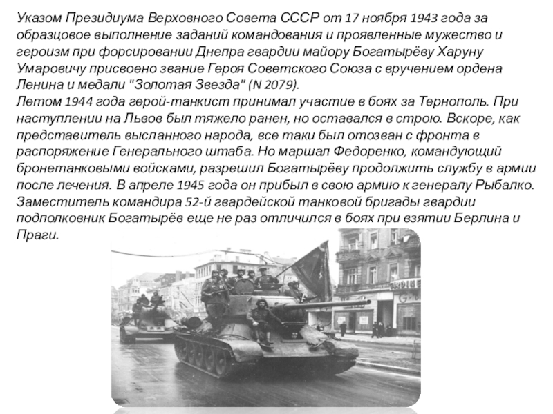 образцовое выполнение заданий командования и проявленные мужество и героизм при форсировании Днепра гвардии майору Богатырёву Харуну Умаровичу присвоено звание Героя Советского Союза с вручением ордена Ленина и медали "Золотая Звезда" (N 2079).
