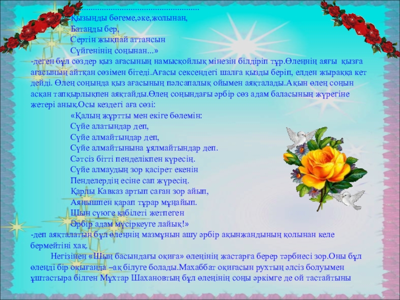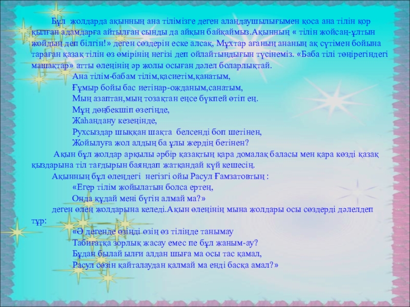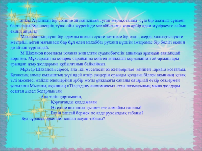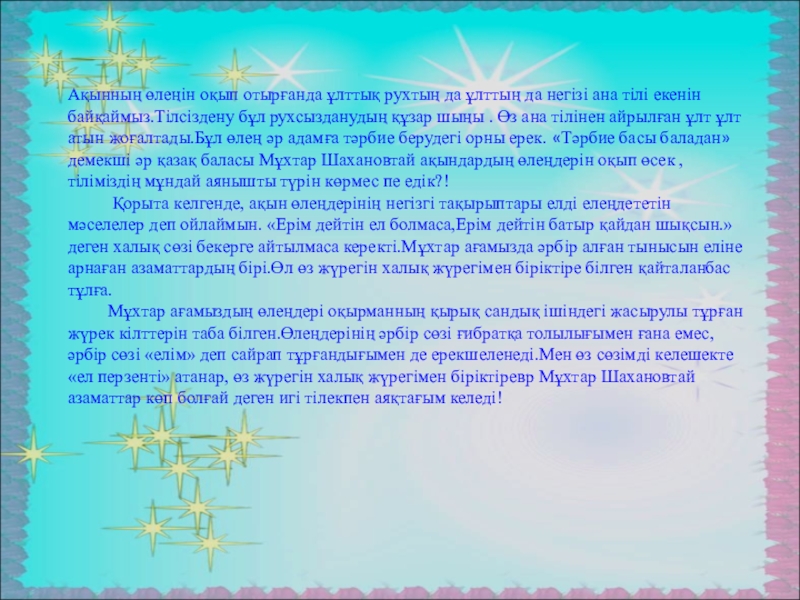 ана тілі екенін байқаймыз.Тілсіздену бұл рухсызданудың құзар шыңы . Өз ана тілінен айрылған ұлт ұлт атын жоғалтады.Бұл өлең әр адамға тәрбие берудегі орны ерек. «Тәрбие басы баладан» демекші әр қазақ баласы Мұхтар Шахановтай ақындардың өлеңдерін оқып өсек , тіліміздің мұндай аянышты түрін көрмес пе едік?!