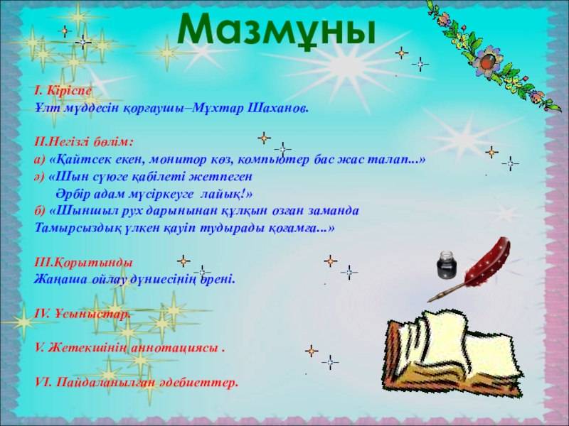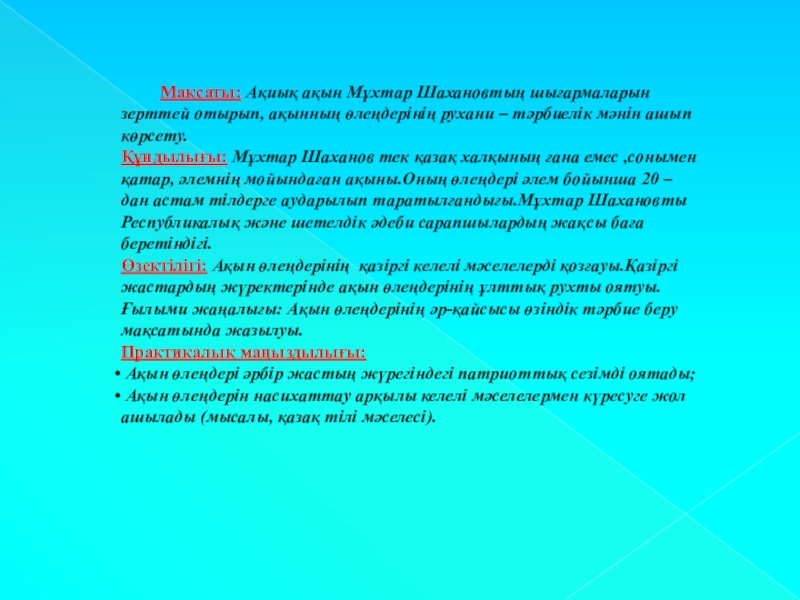 Слайд 2Мақсаты: Ақиық ақын Мұхтар Шахановтың шығармаларын зерттей отырып, ақынның өлеңдерінің рухани