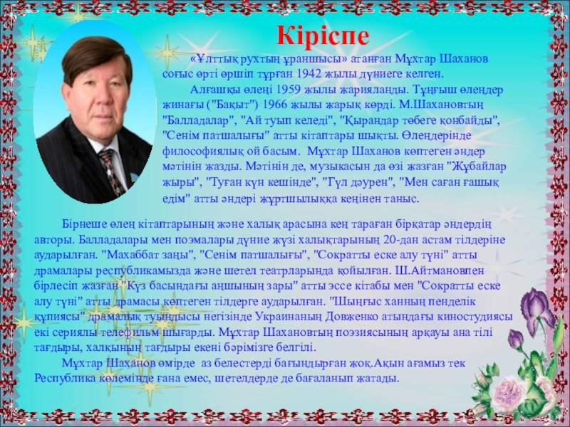 Мұхтар Шаханов өмірде аз белестерді бағындырған жоқ.Ақын ағамыз тек Республика көлемінде ғана емес, шетелдерде де бағаланып жатады.