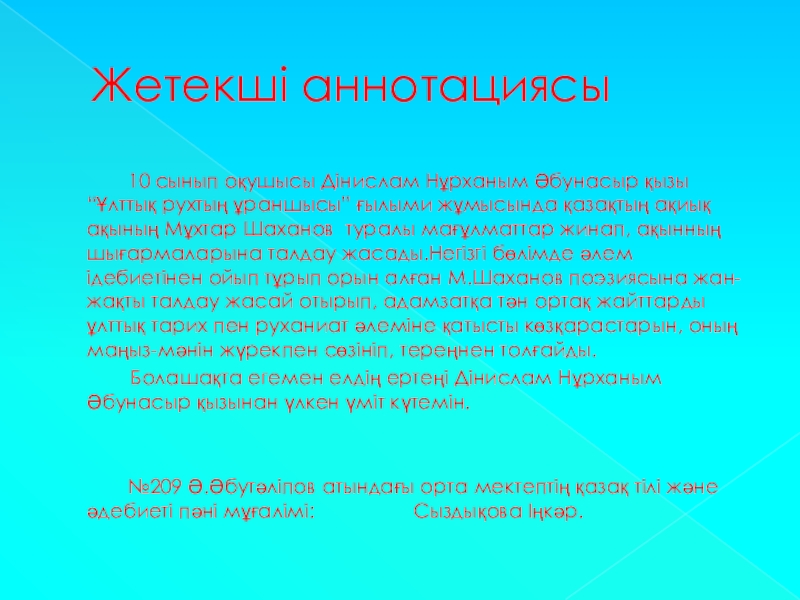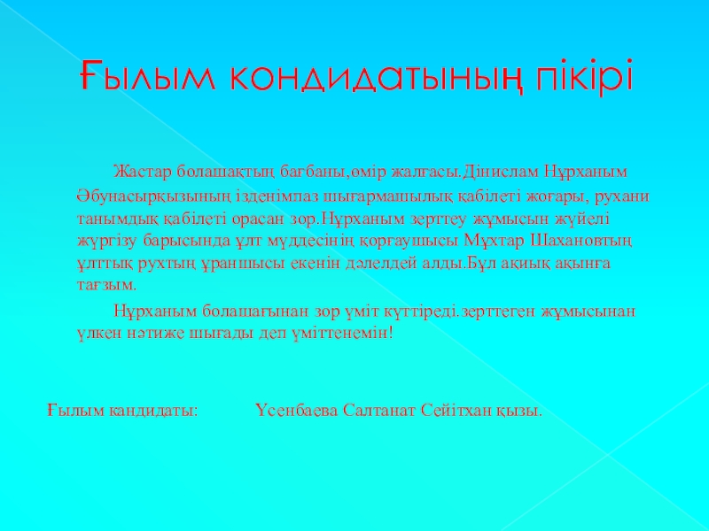 жоғары, рухани танымдық қабілеті орасан зор.Нұрханым зерттеу жұмысын жүйелі жүргізу барысында ұлт мүддесінің қорғаушысы Мұхтар Шахановтың ұлттық рухтың ұраншысы екенін дәлелдей алды.Бұл ақиық ақынға тағзым.