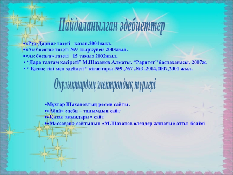 “ Қазақ тілі мен әдебиеті” кітаптары №9 ,№7 ,№3 .2004,2007,2001 жыл.