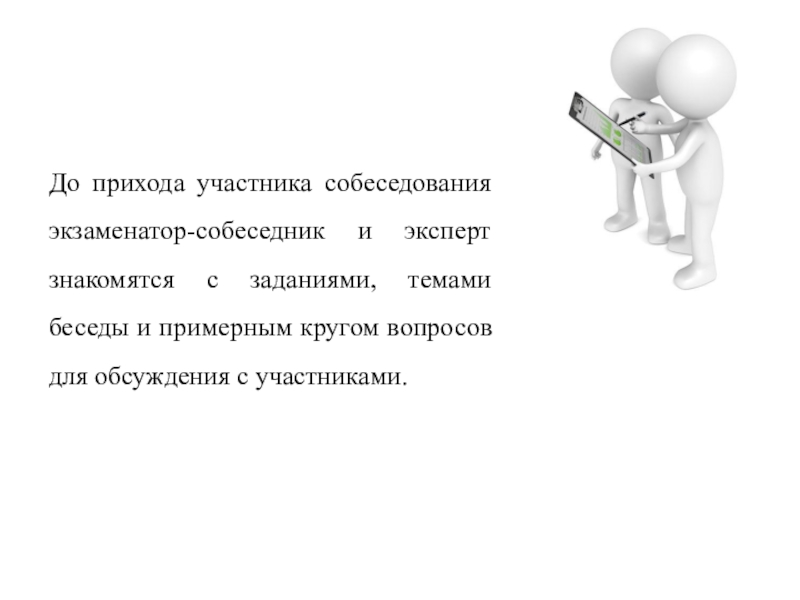 Слайд 12До прихода участника собеседования экзаменатор-собеседник и эксперт знакомятся с заданиями, темами