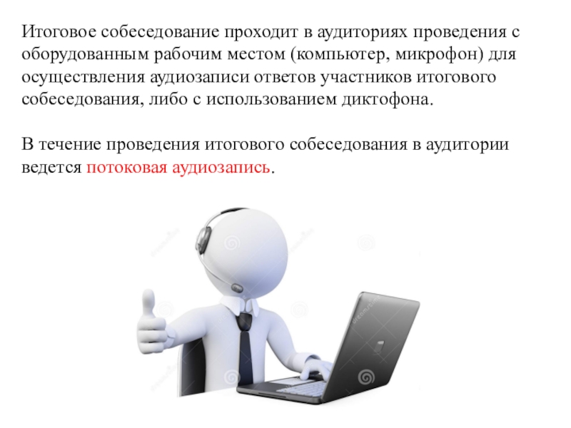 Слайд 5Итоговое собеседование проходит в аудиториях проведения с оборудованным рабочим местом (компьютер,