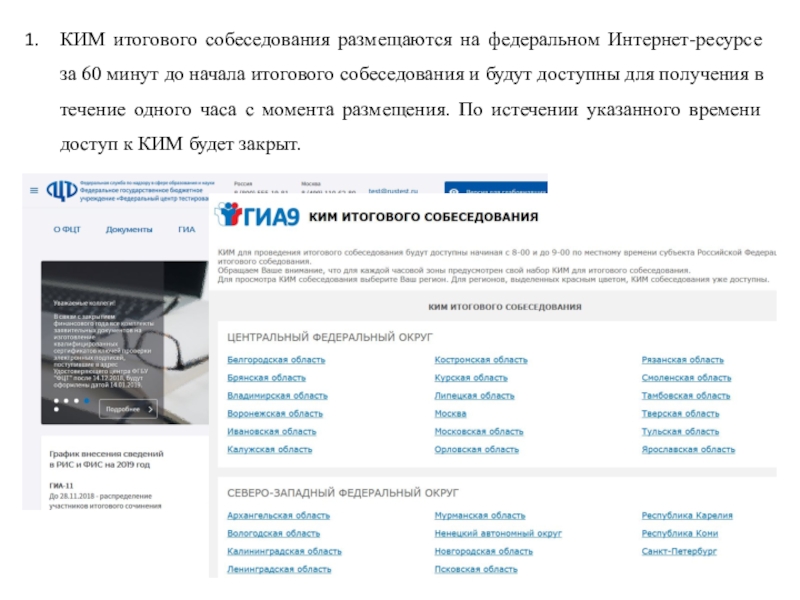 Слайд 6КИМ итогового собеседования размещаются на федеральном Интернет-ресурсе за 60 минут до