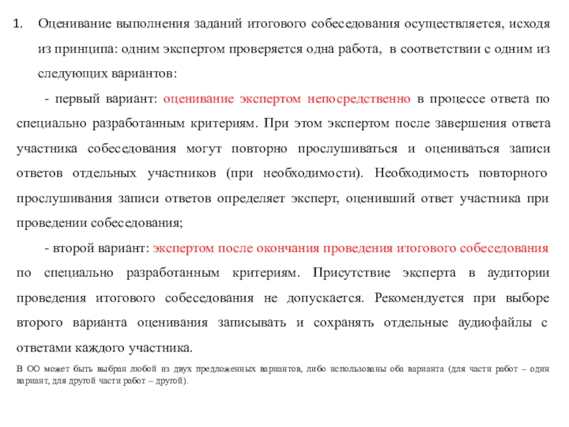Слайд 3Оценивание выполнения заданий итогового собеседования осуществляется, исходя из принципа: одним экспертом