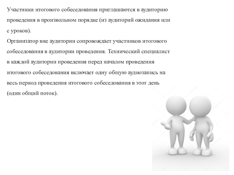 Слайд 13Участники итогового собеседования приглашаются в аудиторию проведения в произвольном порядке (из