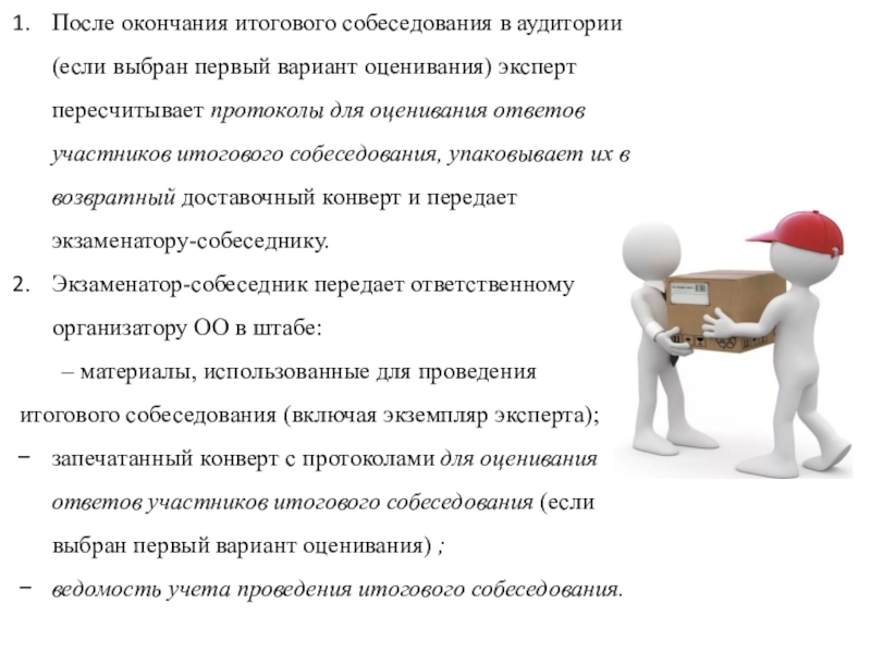 эксперт пересчитывает протоколы для оценивания ответов участников итогового собеседования, упаковывает их в возвратный доставочный конверт и передает экзаменатору-собеседнику.