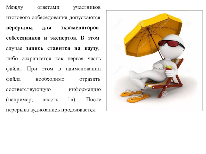 Слайд 19Между ответами участников итогового собеседования допускаются перерывы для экзаменаторов-собеседников и экспертов.